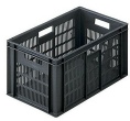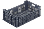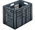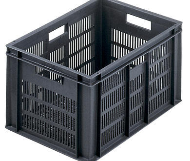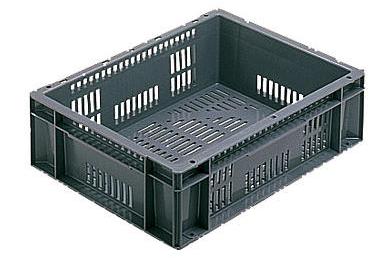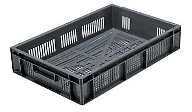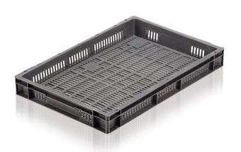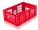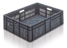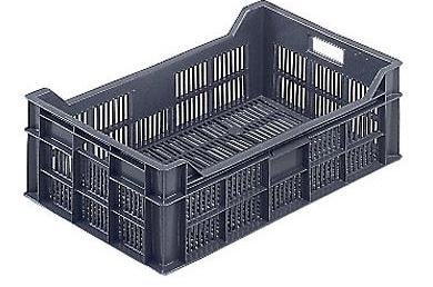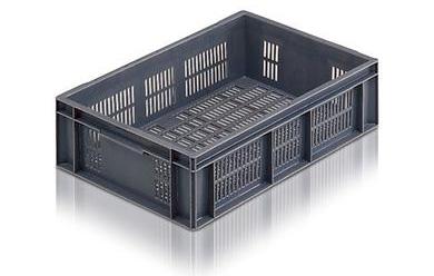 Fond plein et parois ajourés. 2 poignées ouvertes petits côtés. Pas de gerbage 225 mm. Poids 1876 g. Coloris GRIS ou ROUGE.