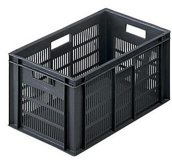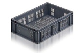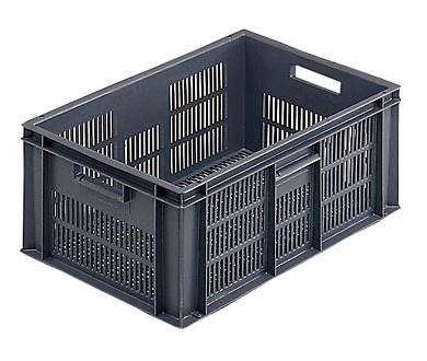 Fond et parois ajourés. 2 poignées ouvertes petits côtés. Pas de gerbage 225 mm. Poids 1830 g. Coloris GRIS