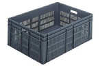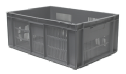 Fond plein et parois ajourés. 2 poignées ouvertes petits côtés. Pas de gerbage 307 mm. Poids 4060 g. Coloris GRIS