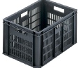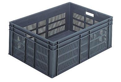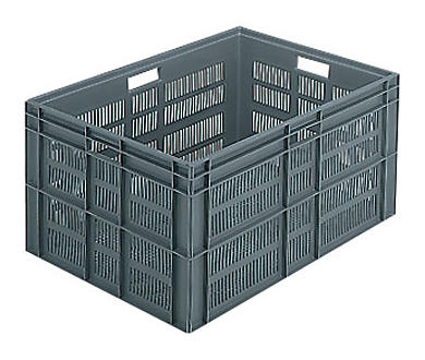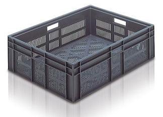 Fond et parois ajourés. 4 poignées ouvertes. Pas de gerbage 220 mm. Poids 3330 g. Coloris GRIS
