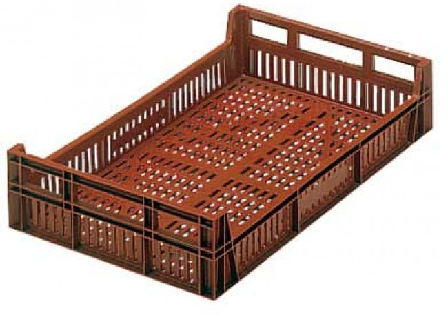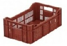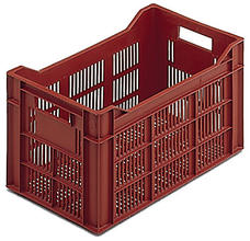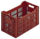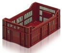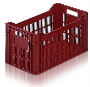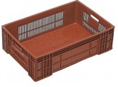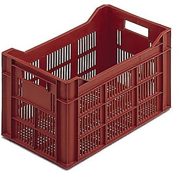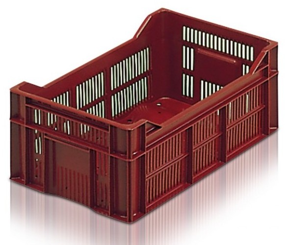 Fond ondulé avec trous d'évacuation et parois ajourés. Poignées fermées. Pas de gerbage 193 mm. Poids 980 g. Coloris BRUN-ROUGE