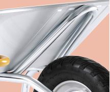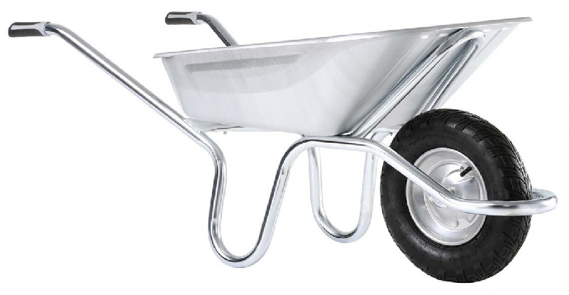 Brouette entièrement galvanisée, traitée anti-corrosion, idéale pour le transport de matières agressives (aliments pour le bétail) et pour les travaux du bâtiment. Charge utile 250 kg. Caisse galvanisée 100 l, épaisseur 1,2 mm, grande contenance. Châssis Alpha tube galvanisé Ø 32 mm, ergonomique et indéformable, avec support soudé sous la caisse.