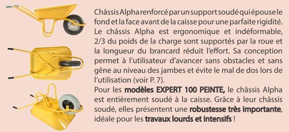Brouette entièrement soudée, d’une robustesse inégalée, destinée aux travaux lourds. Charge utile 250 kg. Caisse peinte 100 l, épaisseur 1,2 mm, ultra renforcée, grande contenance. Châssis Alpha tube peint Ø 32 mm, ergonomique et indéformable, avec support soudé sous la caisse. Roue increvable Ø 400 mm (PF 148), jante métal flasque. Poignées bi-matières. Dimensions : 1420 x 680 x 610 mm. Poids : 16 kg.