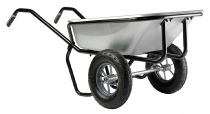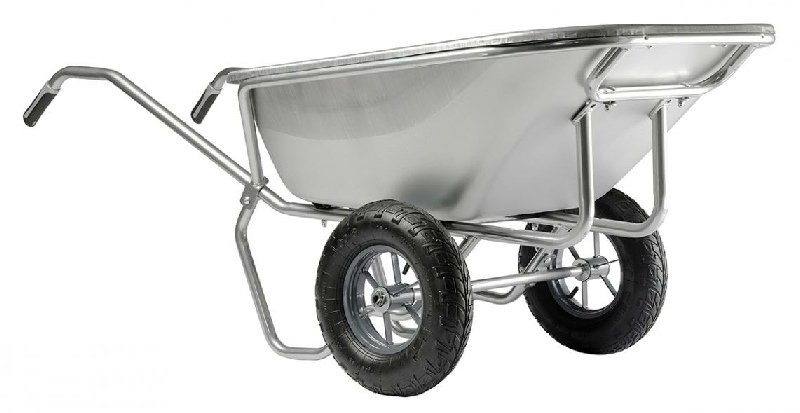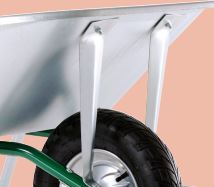 Brouette entièrement galvanisée, traitée anti-corrosion, idéale pour le transport de matières agressives (aliments pour le bétail) ou très volumineuses, et pour les travaux lourds. Charge utile 250 kg. Caisse galvanisée 230 l, épaisseur 1,5 mm, très grande capacité de charge. Châssis tube galvanisé Ø 32 mm formant butoir et jonc de soutien de la caisse. Roues gonflées Ø 400 mm (PF 39), roulements à rouleaux, jantes métal à rayons. Poignées bi-matières. Dimensions : 1777 x 873 x 806 mm. Poids : 29,4 kg.