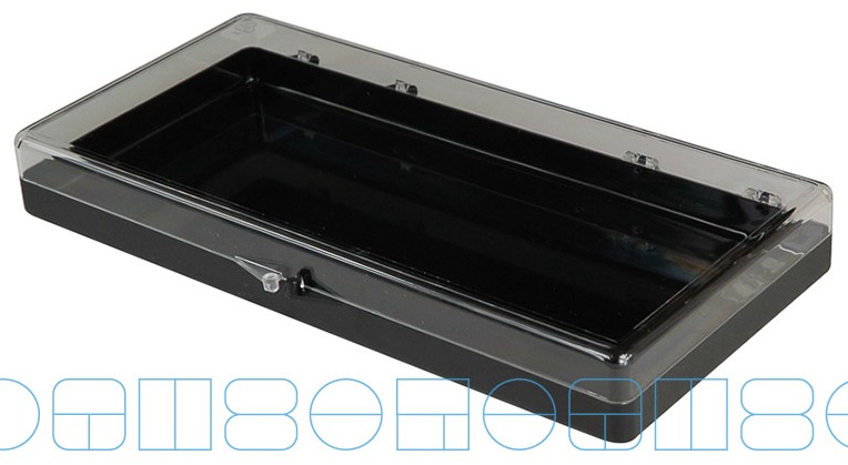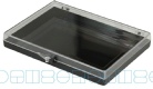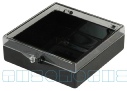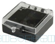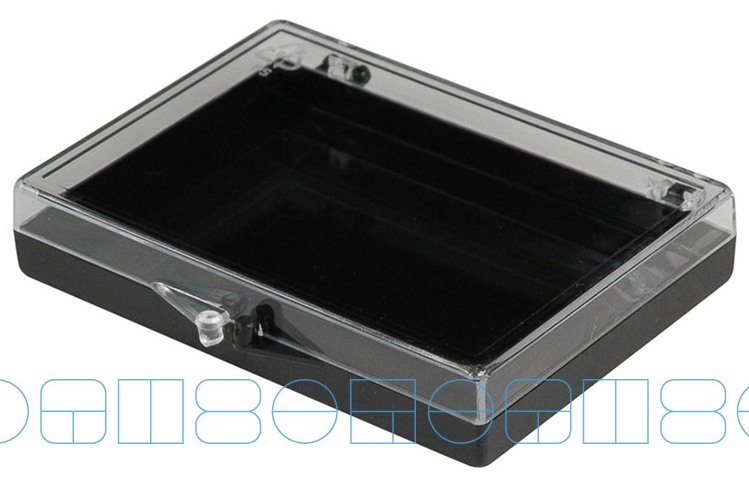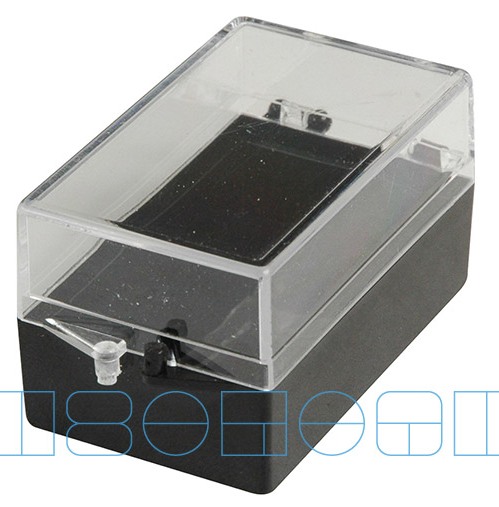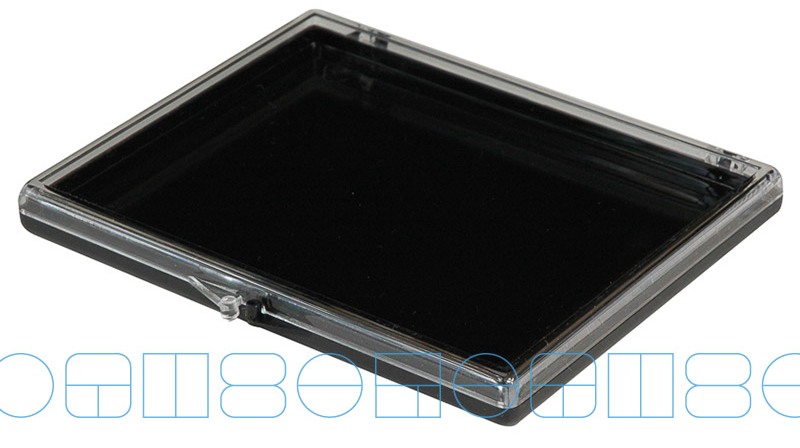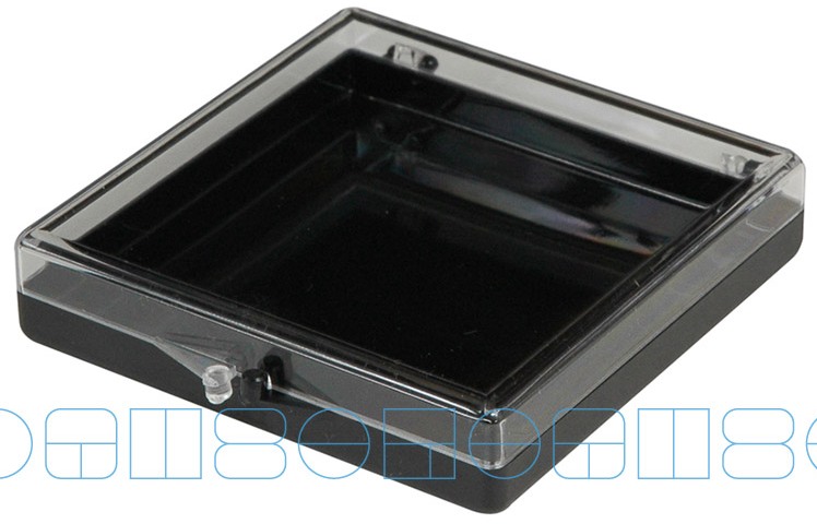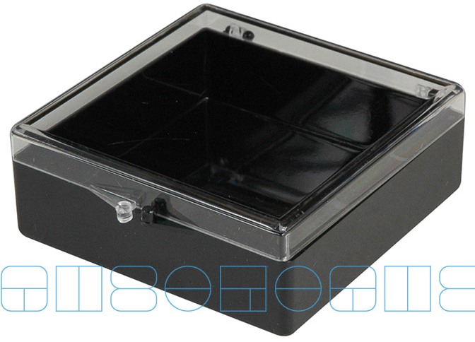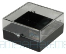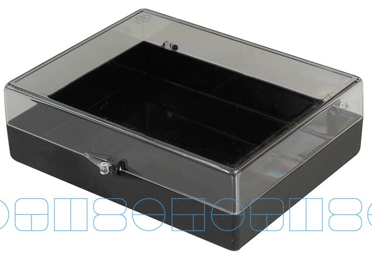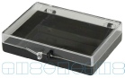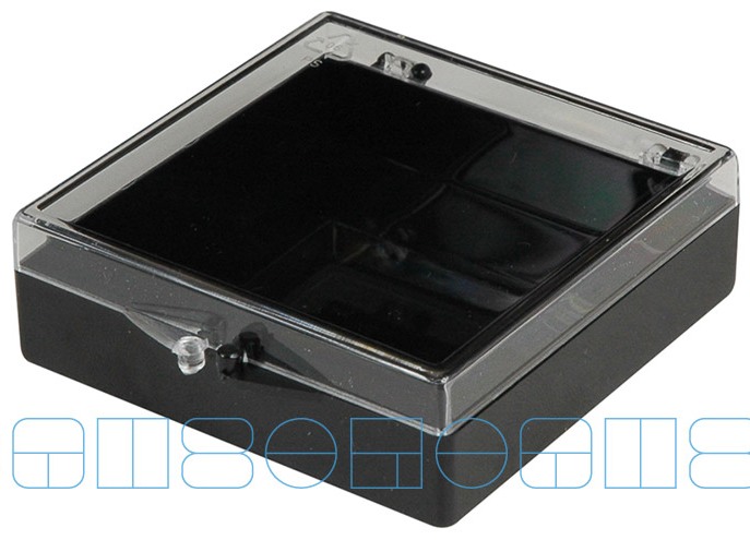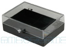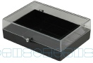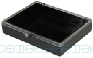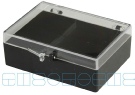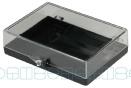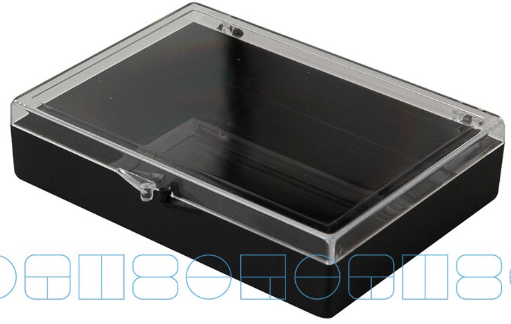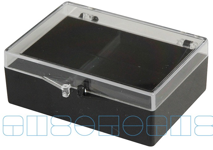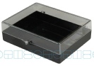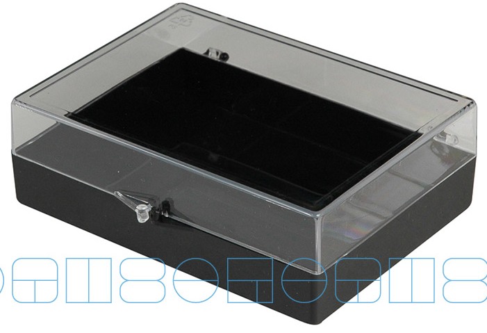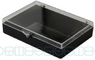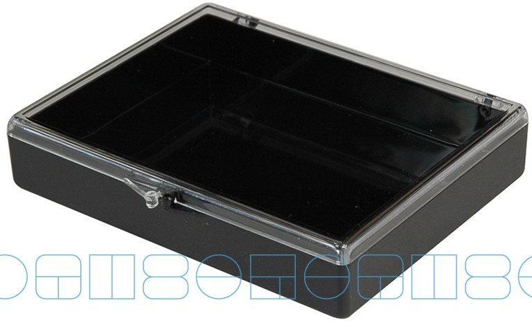 Boîtes à charnières à boules en polystyrol. Le couvercle est transparent, la partie basse est noire.