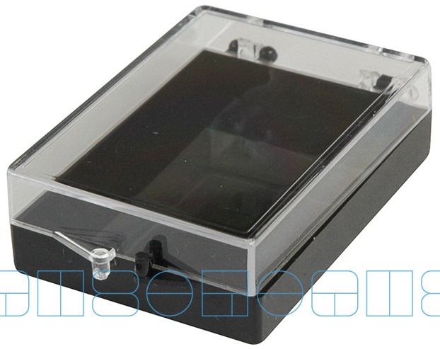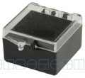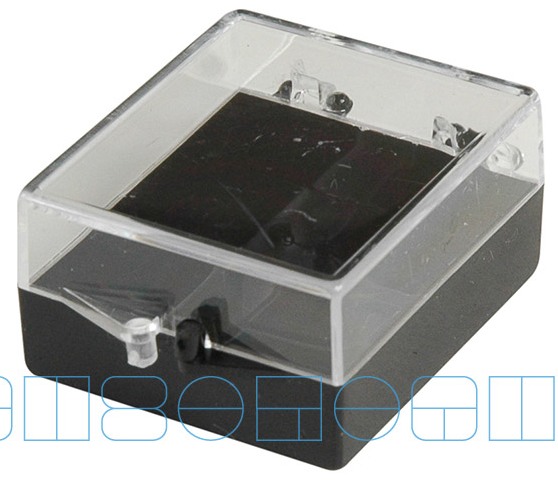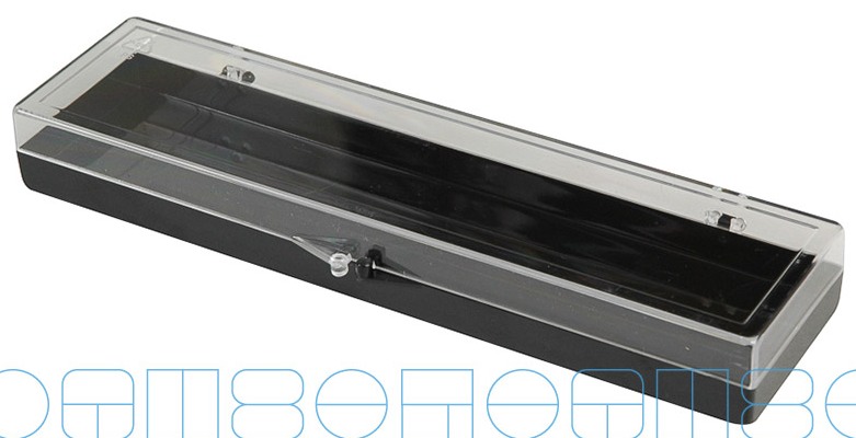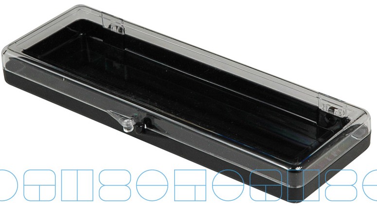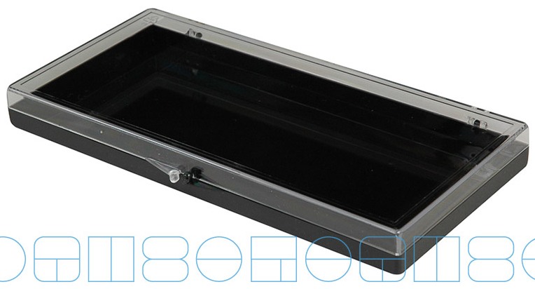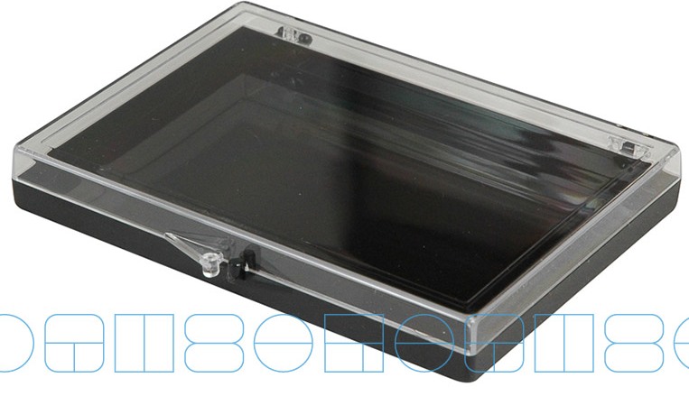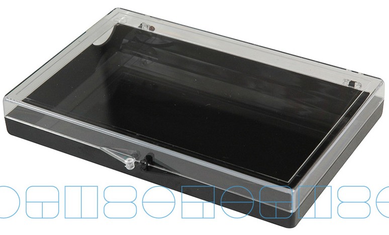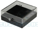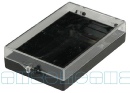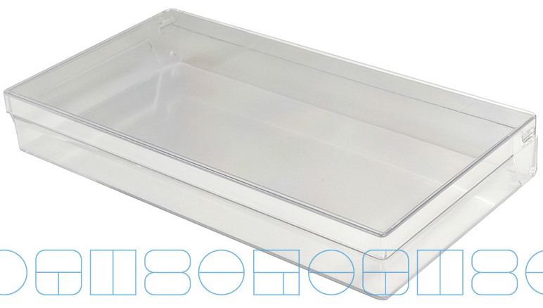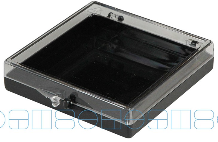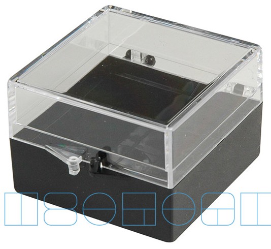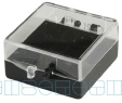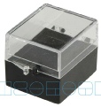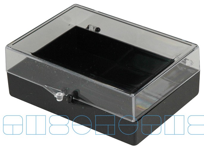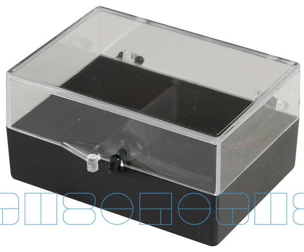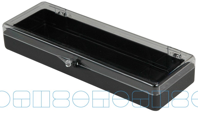 Boîtes à charnières à boules en polystyrol. Le couvercle est transparent, la partie basse est noire.