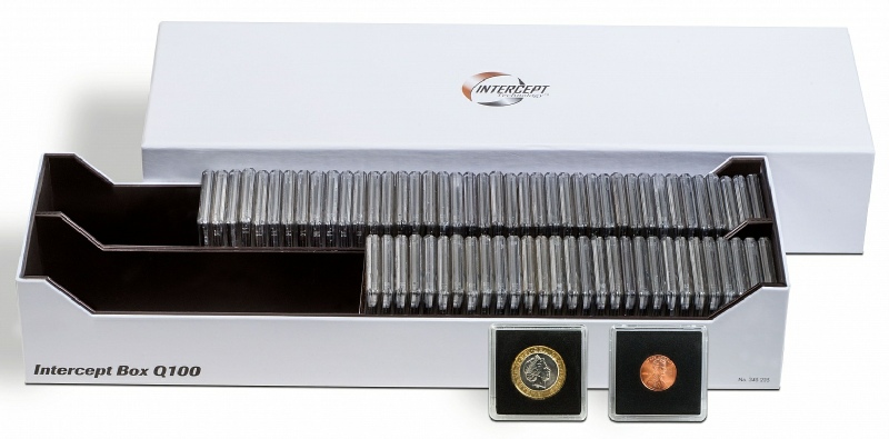 L’intérieur de la box Intercept Q 100 est imprégné du principe actif INTERCEPT®, ce qui protège vos monnaies de l’oxydation. Pour classer env. 300 étuis carton (50 x 50 mm) ou 100 capsules QUADRUM contenant des monnaies en cuivre, or, argent, laiton etc... Format extérieur : 370 x 64 x 125 mm.