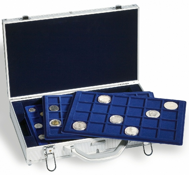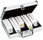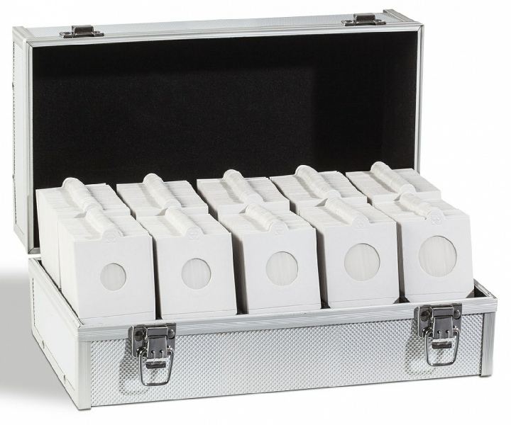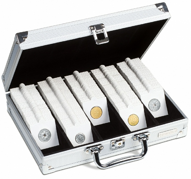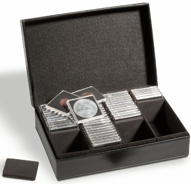 Coffret avec 5 rangées pour classer jusqu’à 650 étuis carton ou 150 capsules QUADRUM. Avec 5 « stoppeurs » pour fixer les rangées incomplètes (les étuis ne tombent pas). Entièrement tapissé de feutrine noire. Fermoir (2 clés). Solide cadre, renforcé avec des coins métalliques. Poignée design et pratique. Le coffret est un outil idéal pour transporter des monnaies. Format extérieur : 292 x 74 x 238 mm.