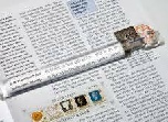 Format de la lentille : 24 x 210 mm. Grossissement x 2,5. Loupe intégrée avec un grossissement x 5 et un diamètre de 15 mm. Règle de 150 mm. Acrylique transparent. Peu adapté à l’observation de monnaies.