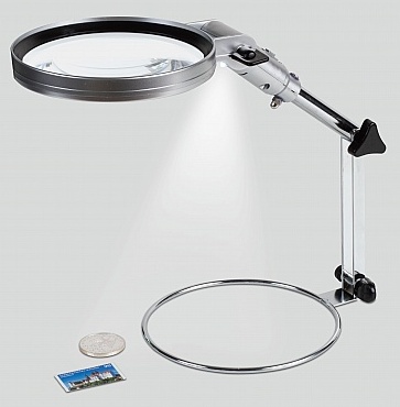 Loupe de table avec grossissement x 2, facilite le travail avec les 2 mains. Lentille acrylique extra large (diamètre 120 mm) pour bien voir des objets de grande taille. Les articulations flexibles permettent différents réglages de la hauteur, de l’angle de vue et de la direction de la lentille. Avec éclairage puissant par LED. Hauteur : 275 mm. Diamètre du pied : 145 mm. Livrée avec piles (3x LR1130).