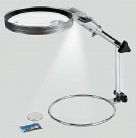 Diamètre de la lentille : 88 mm. Grossissement x 2,5. Petite lentille intégrée de 21 mm de diamètre et grossissement x 5. 2 lampes LED blanches. Livrée avec 3 piles (AAA). Bras flexible. Pied avec stabilisateur pliable. Facilite le travail avec les deux mains.