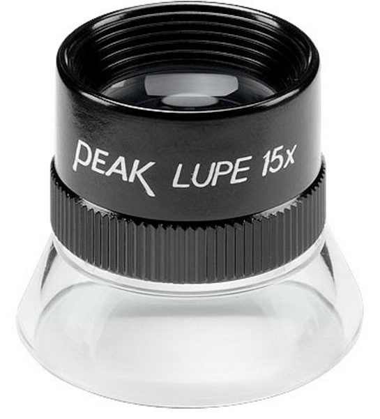 En métal, avec échelle en cm/inch. Grossissement x 5. Champ de vision : 25 x 25 mm. Pliable. Hauteur : 60 mm. Diamètre de la lentille : 28 mm. Noir mat. Peu adapté à l’observation de monnaies.