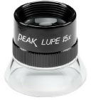 En métal, avec échelle. Grossissement x 10. Hauteur : 35 mm. Champ de vision : 12 x 12 mm. Repliable. Diamètre lentille : 14 mm. Couleur : noir. Peu adapté à l’observation de monnaies.
