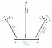 Deux équerres de butée. Quatre pinces de fixation utilisables dans toutes les positions. Plateforme montée sur une rotule ball, orientable dans toutes les directions et pivote à 90°.