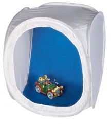 Cette tente diffusante de forme cubique procure un éclairement doux et uniforme. La face avant amovible présente une ouverture pour l’objectif de l’appareil photo. Facile à monter, elle se déplie automatiquement. L’armature particulièrement flexible permet un encombrement minimum une fois pliée. Toiles de fond réversibles blanc/gris et noir/bleu incluses ainsi qu’une housse de transport avec dragonne.