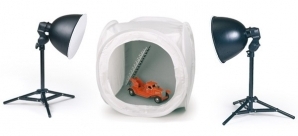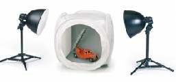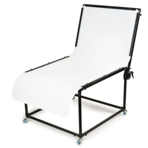 Table de prise de vue compacte pour petits objets avec plateau translucide blanc pour détourage.