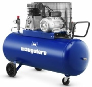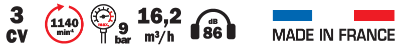 Ils possèdent un pressostat, une soupape de sûreté, un régulateur de pression, une vanne de sortie et deux manomètres (air détendu et pression cuve). Dotés d’un câble d’alimentation électrique (en mono), de roues et d’une poignée de transport, ils constituent des centrales de compression d’une maniabilité exceptionnelle.