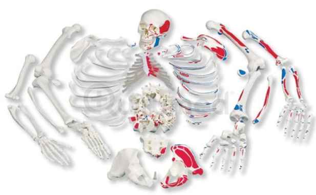 Squelette complet désarticulé. Crâne 3 pièces avec description des muscles.