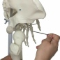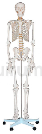 Squelette masculin adulte en position verticale. (L'os hyoïde et les osselets auditifs ne sont pas représentés). Les articulations des membres supérieurs et inférieurs sont articulées. Ce modèle comporte une colonne vertébrale, des racines nerveuses, une artère vertébrale, une hernie discale, un cartilage surligné en vert, un crâne amovible en 3 parties et des extrémités.