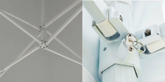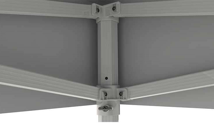 Sa structure parapluie est composée de pieds de section hexagonale 60 x 60 x 2 mm pour la partie supérieure et de 55 x 55 x 2 mm pour la partie inférieure. Les croisillons et les connecteurs en fonte d'aluminium confère, à cette tente pliante, une meilleure résistance dans le temps.