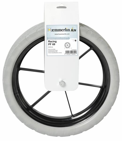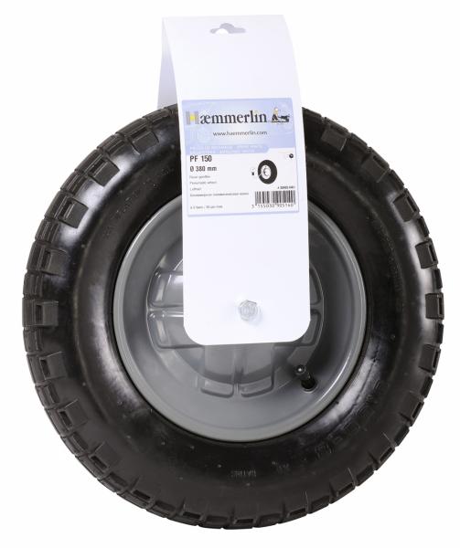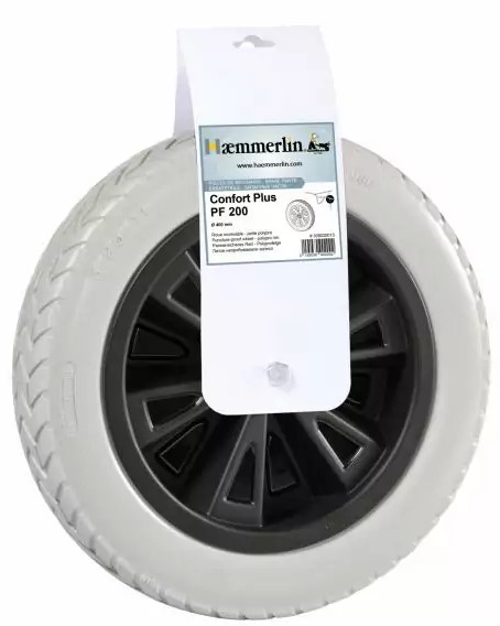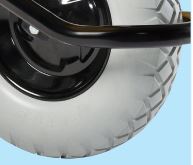 Roue gonflée Ø 400 mm (PF 128), roulement à billes, jante métal flasque ou roue increvable Ø 400 mm (PF 200), jante polypro. Poignées bi-matières.