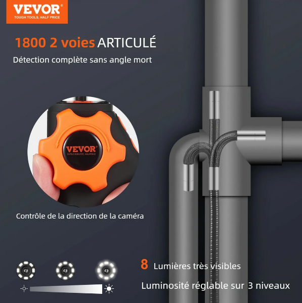 L'endoscope VEVOR adopte une technologie avancée de direction bidirectionnelle à 180 degrés, permettant à l'objectif de pivoter à 180 degrés vers la gauche et la droite. Vous permet d'examiner des zones sous différents angles et d'inspecter les coins les plus profonds et inaccessibles. Pas besoin de rotation fréquente du câble, il suffit de faire tourner la molette de commande de direction de la caméra pour inspecter différentes zones sous tous les angles