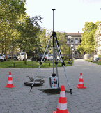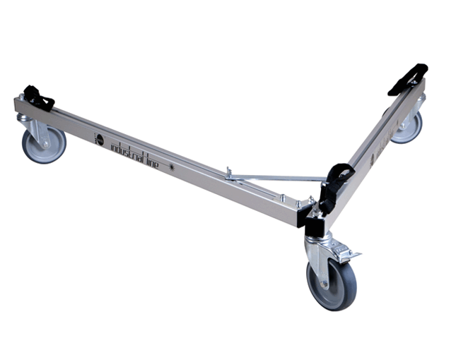 Chariot très robuste muni de grandes roulettes. Les pointes des bases du trépied sont simplement placées dans les évidements prévus à cet effet, et fixées avec une sangle souple. Les 3 roulettes sont orientables et blocables. Pour le travail avec scanneurs au-dessus d’un puits, l’espace sous le centre du trépied est dégagé et très accessible.
