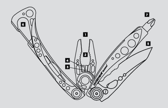 Le Leatherman Skeletool possède une lame en acier inoxydable, une pince, un porte embout, un clip de poche amovible et mousqueton / décapsuleur.