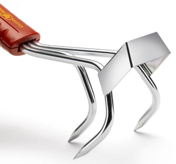 Outil double fonction : permet de décroûter et d'ameublir la terre grâce aux 3 dents ainsi que de sarcler et désherber grâce à la lame tranchante