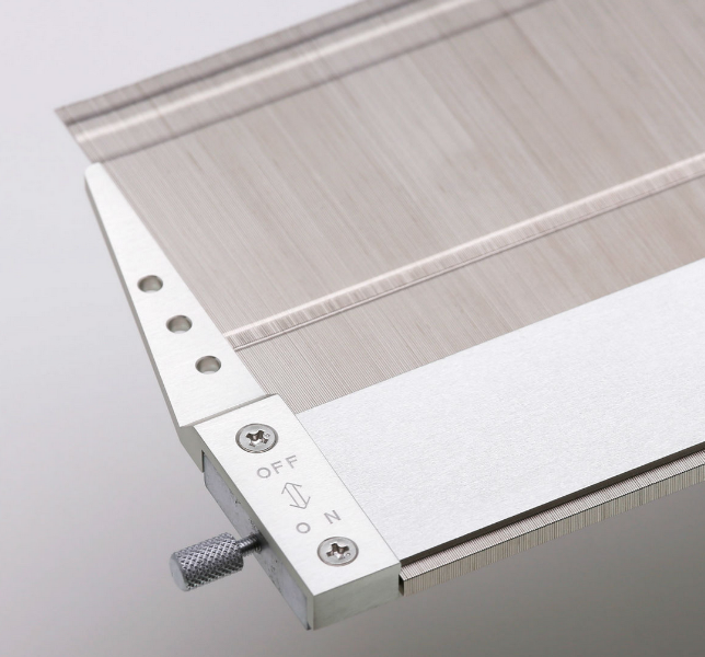 27 lamelles biseautées par centimètre. Longueur totale : 120 mm. Dimensions utiles : 75 x 46 mm.