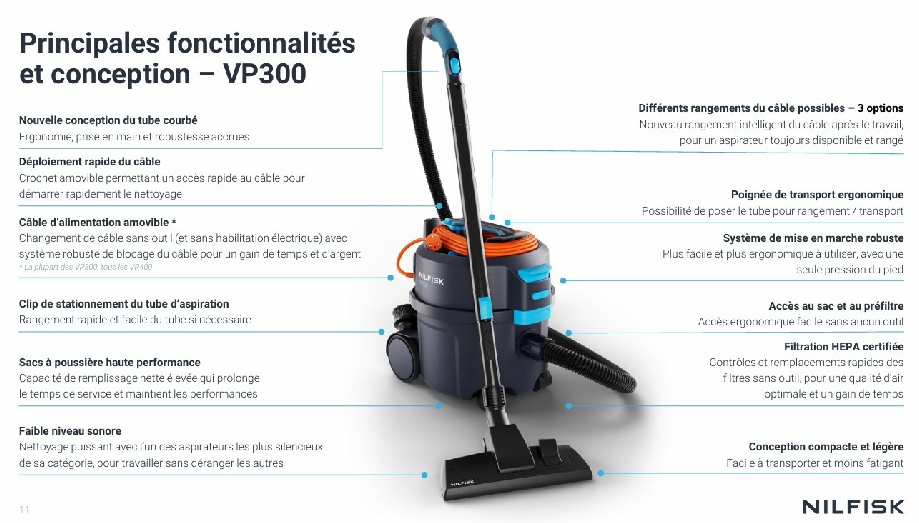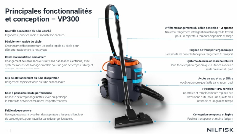 Le Nilfisk VP300 HEPA est conçu pour le nettoyage quotidien des locaux tels que les bureaux, les chambres d'hôtel, les magasins de détail, et peut être utilisé en présence du public grâce à son faible niveau sonore.