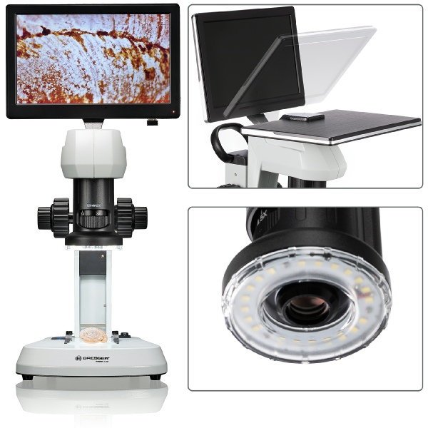 La préparation peut être confortablement observée via l'écran de 22,5 cm de diagonale. L'utilisation confortable et conviviale rend le microscope numérique particulièrement adapté à une utilisation quotidienne dans l'atelier. Les mesures, le contrôle de la qualité des surfaces ou le test des composants et des matières premières sont réalises facilement avec le microscope d'atelier. La présentation des insectes, des plantes et des rochers est également impressionnante.
