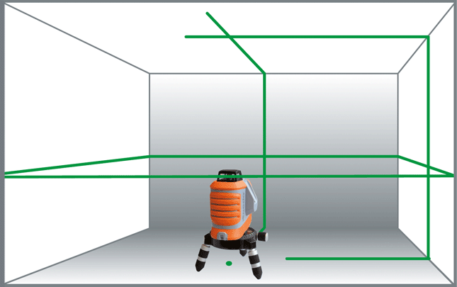 Laser multiligne à calage automatique pour niveler, aligner et reporter des angles droits avec rapidité dans l'aménagement intérieure.
