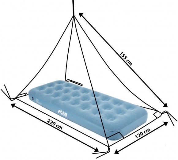600 trous/cm². Pour lit monoplace. Point d’attache au sommet ainsi qu’aux 4 coins avec lests (cailloux, sable, …).