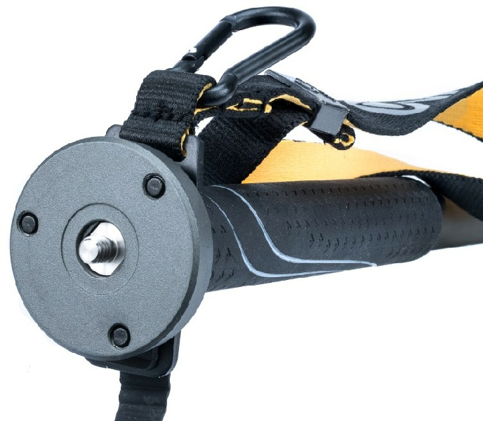 Monopode fourni avec une grande dragonne réglable, un clip mousqueton d'attache, un capuchon amovible de protection sur la vis, une petite clé allen