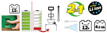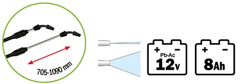 Interrupteur marche/arrêt. Temps de charge : 3 h. Durée d'utilisation : 4 h. Pression de travail : 3 bars.