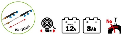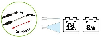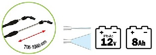 Batterie 12 V - 8,0 Amp. Chargeur 220-240V ~ 50/60 Hz. 12 V - 1200 mA.