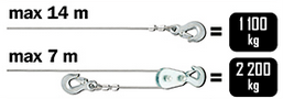 Capacité : 625 / 1250 kg. Câbles : Ø 6 mm x 3,4 m. 3 crochets.